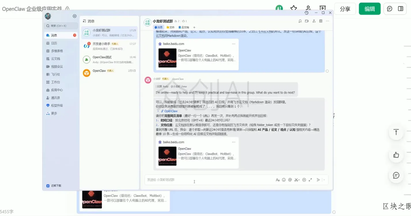 OpenClaw企业级应用实战godlike1小时前更新关注0945 课程介绍: 从基础概念与工作原理入手,逐步讲解安装部署、中文版配置及功能体验核心操作。重点拆解 OpenClaw 与飞书的全流程对接,涵盖通信架构、插件安装、设备授权等关键步骤,还会实操本地文件、个人知识库、日程日历的智能管理,以及定时任务、多模态生成、桌面截图分析等实用功能,助力学员打造本地化 AI 数字员工,实现大模型与企业本地业务场景的深度融合。 视频截图: 课程目录: 01.OpenClaw基础概念与工作原理【这节画面模糊】.mp4 02.OpenClaw安装部署与模型配置.mp4 03.OpenClaw中文版安装.mp4 04.OpenClaw功能体验.mp4 05.OpenClaw飞书通信架构.mp4 06.OpenClaw安装飞书插件.mp4 07.OpenClaw接入飞书应用.mp4 08.OpenClaw设备配对授权.mp4 09.OpenClaw本地文件管理.mp4 10.OpenClaw个人知识库管理.mp4 11.OpenClaw日程管理与日历同步.mp4 12.OpenClaw定时任务与主动推送.mp4 13.OpenClaw多模态应用与图片生成.mp4 14.OpenClaw桌面截图与视觉洞察.mp4 .erphpdown-box, .erphpdown-box + .article-custom-metas{display:block;} 资源下载 下载价格8 金币 VIP免费 立即下载 如有发现链接失效,请联系站长 课程下载: OpenClaw企业级应用实战此内容为付费资源,请付费后查看¥2.99登录购买付费资源© 版权声明 区块之眼 - 尊重原创,保护知识产权 1、本网站名称:区块之眼 2、本站永久网址:https://blockeye.top/ 3、本站文章部分内容可能来源于网络,仅供学习参考,如有侵权请联系客服:services@blockeye.top 进行处理。 4、本站一切资源不代表本站立场,并不代表本站赞同其观点和对其真实性负责。 5、本站一律禁止以任何方式发布或转载任何违法的相关信息,访客发现请向客服举报。 6、本站资源大多存储在云盘,如发现链接失效,请联系我们,我们会第一时间更新。 THE END网创项目 喜欢就支持一下吧点赞5分享收藏